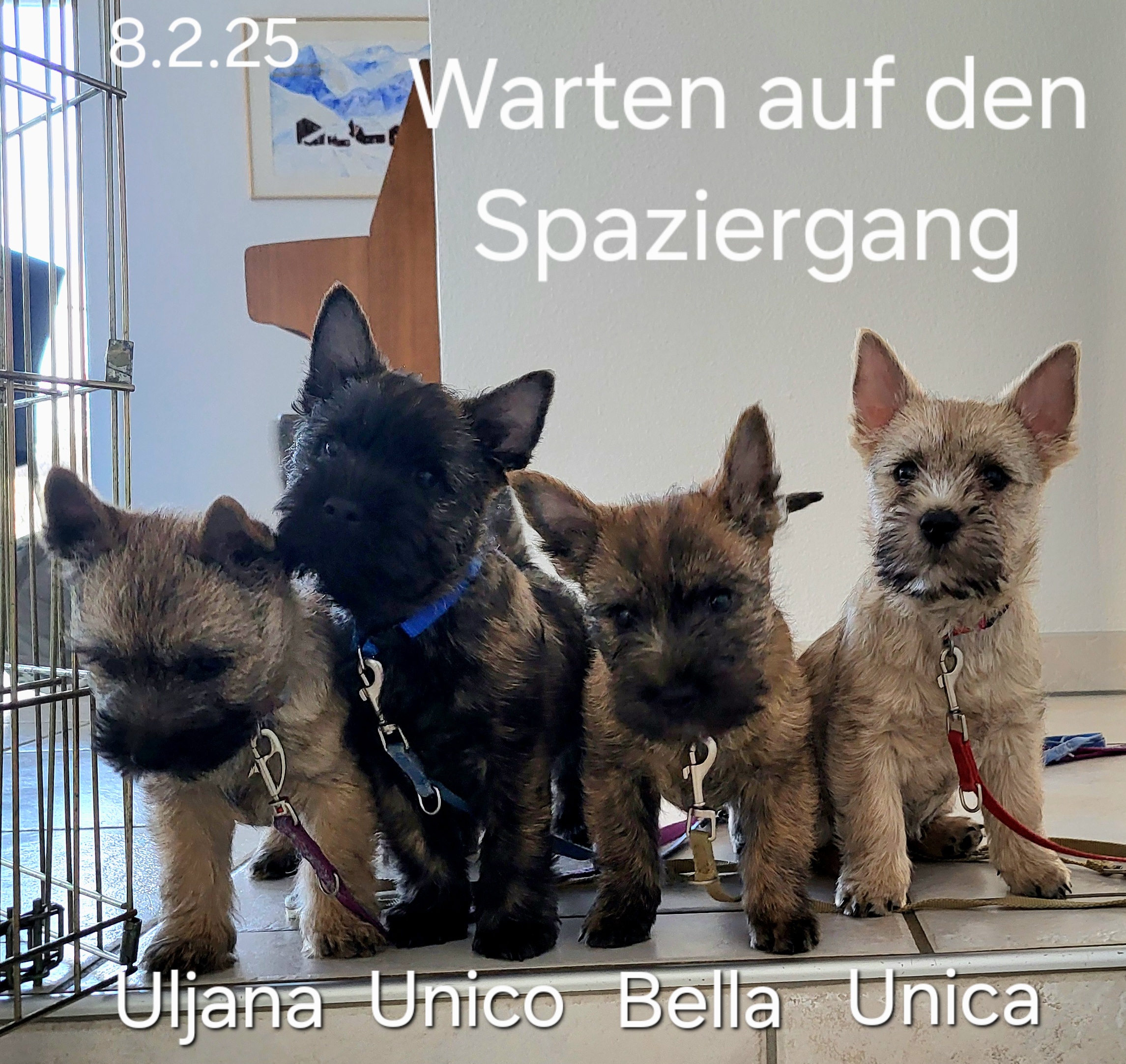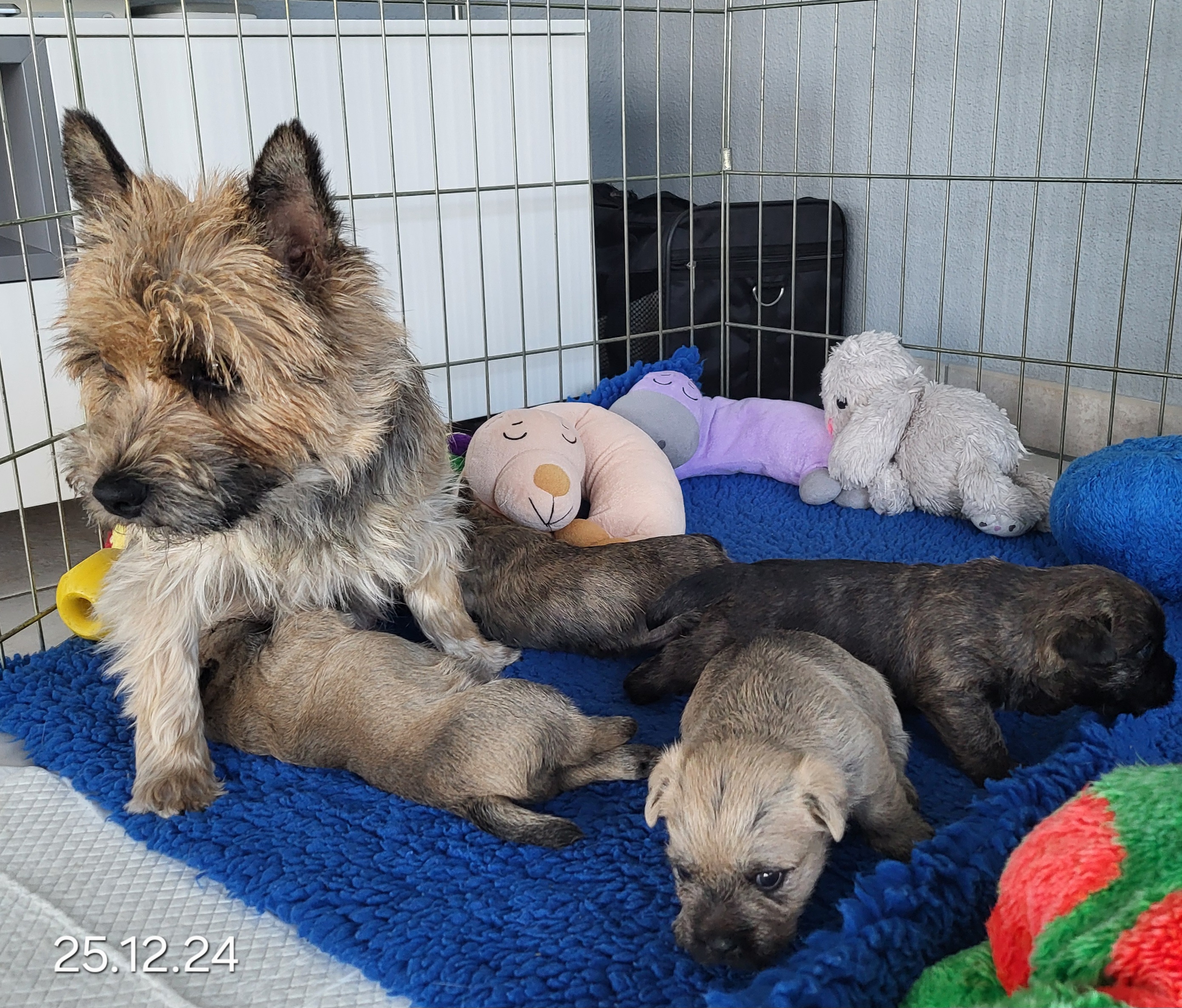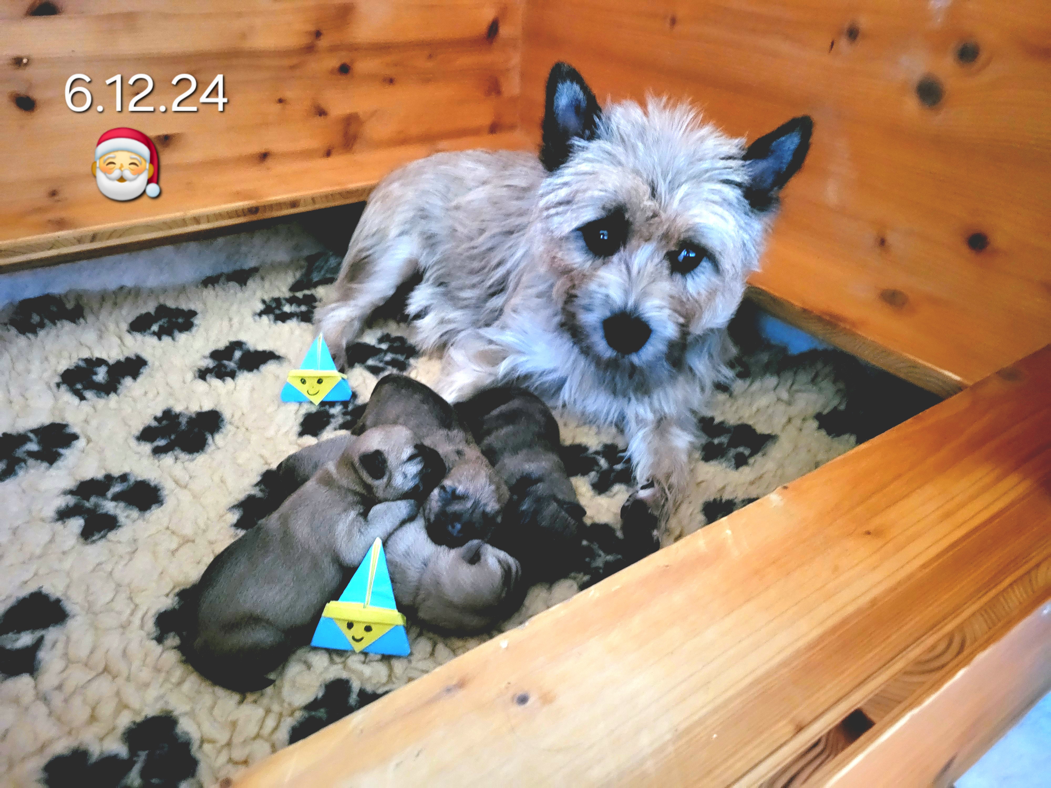 Die Welpen werden entwurmt, geimpft und tragen einen Microchip. Sie wachsen im Haus und Garten zusammen mit anderen Cairns und Meerschweinchen auf. Sie sind an Kinder, ans Autofahren und ans Alleinsein gewöhnt.